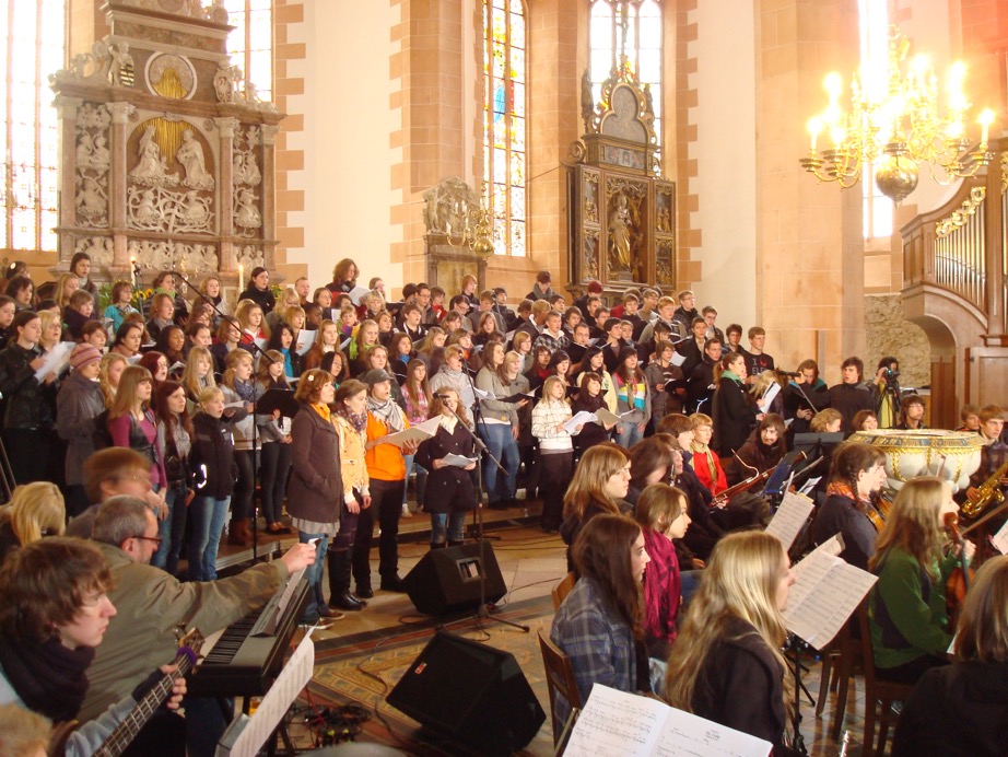 Am ersten Tag fand die Einteilung der Schüler in die verschiedenen Ateliers statt. So gab es im Atelier 1 eine Gospelmesse, Atelier 2 widmete sich der A-Cappella-Musik, Atelier 3 studierte Beethovens Coriolan-Ouvertüre ein, Atelier 4 beschäftigte sich mit Tanz und Malerei und im Atelier 5 fand die Dokumentation der Begegnung statt. 4 Tage lang arbeiteten die Schüler - zusammengewürfelt aus unterschiedlichen Schulen und Bundesländern - auf ein Ziel hin, das harmonische musikalische Einheit hieß sowie gelebte Einheit zwischen Ost und West. Und die Familien, Schulen und Stadtverwaltung halfen stets dabei und scheuten darüber hinaus keine Kosten um den Schülern den Aufenthalt so angenehm wie möglich zu machen. Es gab jeden Tag kostenlose Verpflegung für über 300 Schüler, immer standen frisches Obst und Getränke in den Probenräumen zur Verfügung und weitere Veranstaltungen rundeten einen gelungenen Aufenthalt ab. So begeisterte der MPG-Chor das Publikum in zwei umjubelten Eröffnungskonzerten, sowie am Sonntagmorgen im Gottesdienst. Neben 2 Jugendpartys gab es auch eine erwähnenswerte Museumsnacht, in der die Schüler ebenfalls kostenlos verschiedene Attraktivitäten Annaberg-Buchholz´ besuchen konnten. So bekamen sie Führungen im ehemaligen Silberbergwerk, erlebten im Frohnauer Hammer alte Schmiedekunst, sahen Steinmetze bei der Arbeit, erlebten ihre Partnerschulen mit eigenen Schulprojekten und konnten letztendlich in der größten spätgotischen Hallenkirche Sachsens den Turm besteigen, wo der Türmer nach alter Manier jede Stunde sein Lied sang „Hört ihr Leut und lasst euch sagen“ um den Bürgern die Zeit anzusagen und ihnen mittzuteilen, dass nun Gott über sie wache.